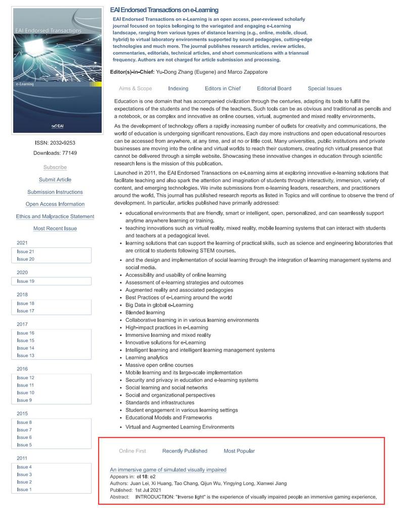 必一运动1902班雷娟、黄袭、常涛、龙莹莹、吴其俊等同学,结合学科专业,关爱特殊人群,基于Unity3D平台开发了一款沉浸式体验游戏《逆光》,并撰写论文“An immersive game of simulated visually impaired”发表于欧洲学术期刊EAI Endorsed Transactions on e-Learning