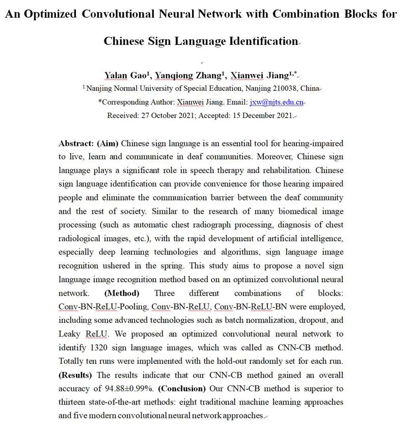 该论文提出了一种基于优化卷积神经网络的新型手语图像识别方法,采用三种不同的块组合,融入BatchNormalizationDropoutLeaky ReLU等流行技术,对1320幅手语图像进行分类识别,获得了94.88±0.99% 的整体准确度,优于对比的十三种先进方法。该论文也是必一运动教师国家社会科学基金项目(Grant No. 20BTQ065 ---“基于手语词汇语料库的语义知识挖掘研究”子课题研究成果之一。
