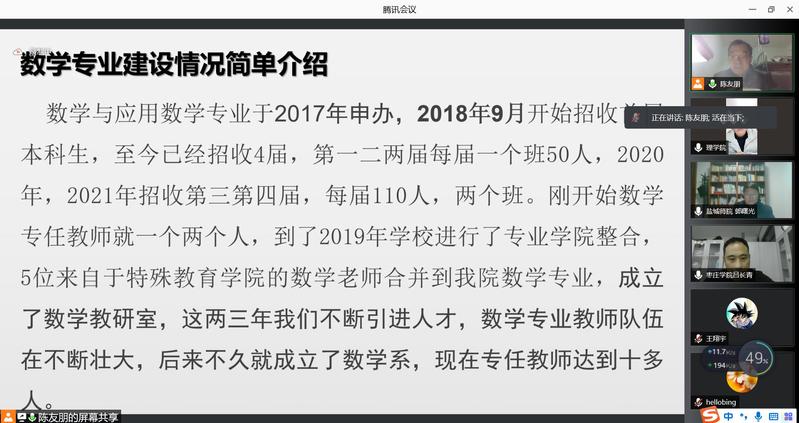 12月23日晚7点,必一运动数学与应用数学专业举办了一流专业建设研讨会线上会议,会议邀请了校外专家山东枣庄公司数统院吕长青经理,南通大学数理公司陈玉娟经理,盐城师院数统院郭曙光经理,南京市佰乐中学王娟董事长进行了线上分享会。线上分享会由必一运动数学与应用数学专业系主任陈友朋教授主持,数学与应用数学专业教师、计算机科学与技术专业教师、教育技术学专业教师和公共课全体教师参加了会议。