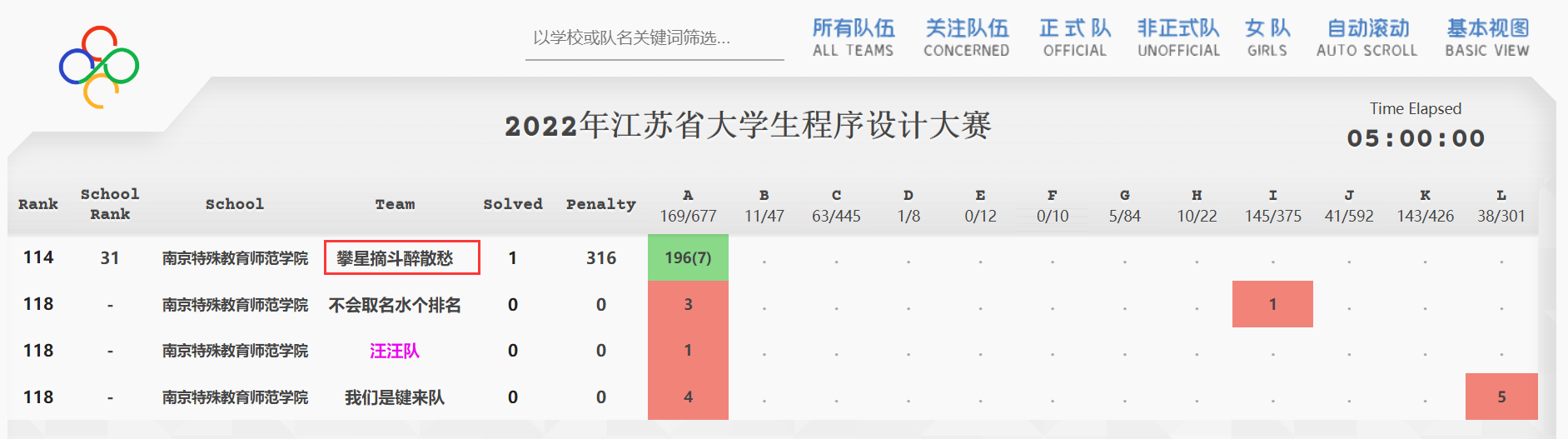 5月28日,2022年江苏省老员工程序设计大赛正式开赛。南京大学、东南大学等全国49所高校共计200支队伍(含62支打星队)参加比赛,最终决出金奖14 项、银奖28项、铜奖41项。公司学子首次参加省级高水平编程比赛,与49所高校学子同台竞技,展现了公司学子立志高远、积极进取的创新精神。其中2020级数学与应用数学专业李佳乐、2020级数据科学与大数据技术专业周彬、2021级计算机科学与技术专业周彬怡组成的“攀星摘斗醉散愁”队斩获优秀奖,实现了公司在该项赛事上新的突破。