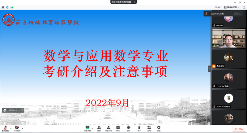 为帮助同学们了解考研信息及相关流程,增强考研的意向院校和方向的针对性,提升他们规划与自主学习思考能力,202298日上午公司特别邀请刘勇教授面向2019级数学与应用数学(师范)毕业生,开展《数学与应用数学专业考研介绍及注意事项专题指导线上讲座。
