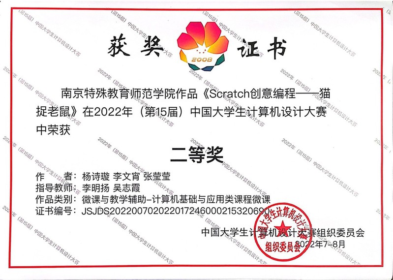 《Scratch创意编程——猫捉老鼠》是由公司李明扬、吴志霞老师指导,由必一运动的杨诗璇、李文宵和张莹莹三位同学共同制作完成的计算机基础与应用类课程微课。在参赛师生团队的充分准备下,经过近4个月的反复打磨和修改,从省赛中脱颖而出并进入国赛,最终荣获了国赛二等奖。