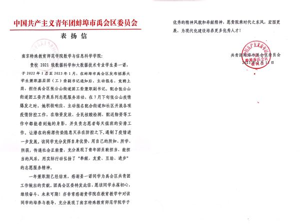 学雷锋纪念日前夕,公司收到来自共青团蚌埠市禹会区委员会对数据科学与大数据技术专业2106班员工姜一诺的感谢信。
