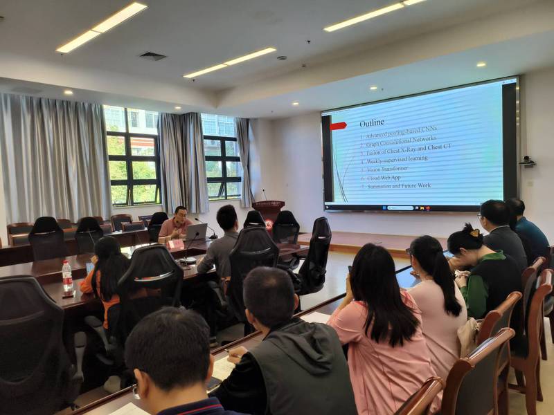 面向公司员工的报告,以科普为主,旨在激发大家的兴趣。张教授以新冠诊断研究为主线,从传统的AI识别到迁移学习,再到现在非常热的生成式预训练Transformer模型,图文并茂,同学们听得津津有味。报告结束后,张教授就同学们提出的孤独症诊断识别新方法、人工智能与就业选择、生成式内容研究、动态手语识别等主题进行了互动交流。