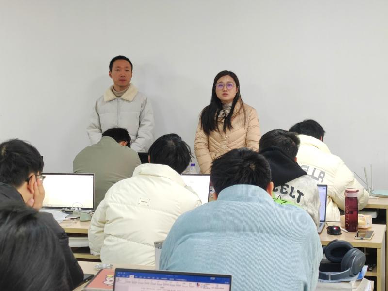 走进教室,丁雯书记、张国盛老师与同学们亲切交流。丁雯书记对同学们认真备考的精神风貌表示充分肯定,同时表达了公司对考研工作的高度重视与全力支持,并悉心叮嘱同学们在最后的冲刺阶段要调整好自己的身体状态,注意劳逸结合,合理安排复习时间,做到全力以赴、张弛有度,充分利用好最后的复习时间,查缺补漏,以最好的状态迎接考试。张国盛老师详细询问了同学们的复习进展以及遇到的实际困难,结合自身经历分享了备考策略和应试技巧,鼓励同学们在考研复习中学会创新方法,享受备考过程,发挥出最佳成绩。