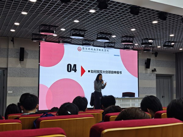 樊琬老师着手于创新创业大赛“我敢闯,我会创”的赛事理念,生动地为同学们阐述了“何为创新创业”、“应该如何去做好双创”,同时,她简要介绍了常见的几类创新创业比赛,包括中国国际老员工创新大赛、挑战杯、公益创业大赛等。其中她重点讲解了大创项目申报书的撰写,详细解读各部分内容。