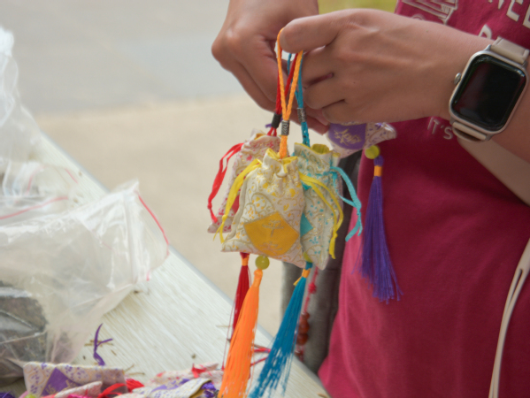 在活动中,志愿者通过图文海报与现场讲解,系统介绍了端午节作为国家级非物质文化遗产的历史渊源以及活动规则与奖励机制,同学们立刻热情高涨,纷纷投身到活动之中。香包作为端午节的传统习俗,承载着驱邪祈福的美好寓意,同时还有提神醒脑的实用功效。