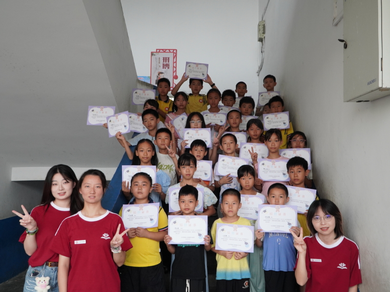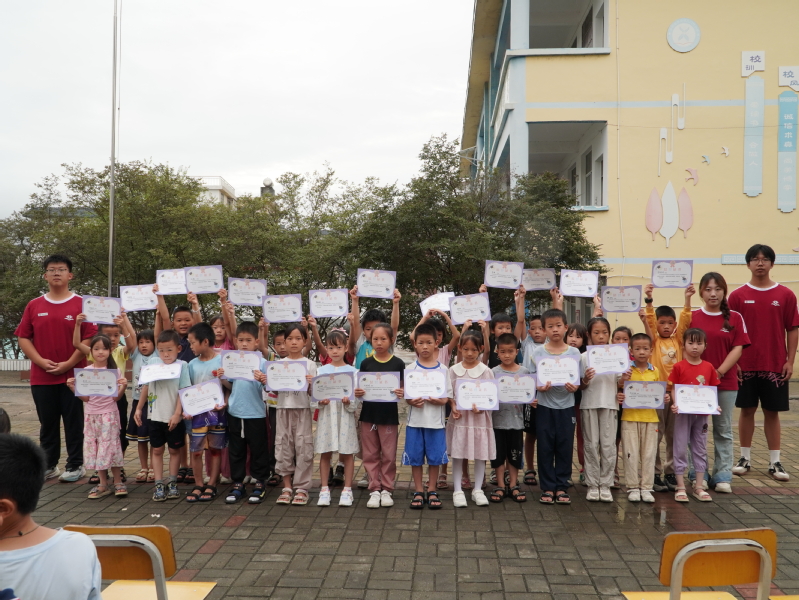 仪式最激动人心的时刻正是结营证书颁发环节。实践团成员们依次为一至六年级的学员们颁发证书,孩子们手捧证书,脸上洋溢着自豪与喜悦。